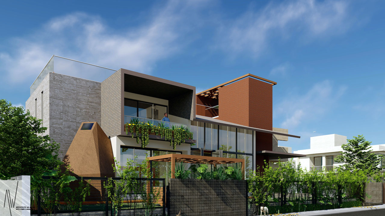 The master bedroom was accessed by a bridge and given a large living area and balcony, creating a luxurious feel. The entry porch was given a good height, becoming a pivotal tower that welcomed guests to the entry. The elevation of the building stood out in the locality, making it a unique addition to the neighborhood.