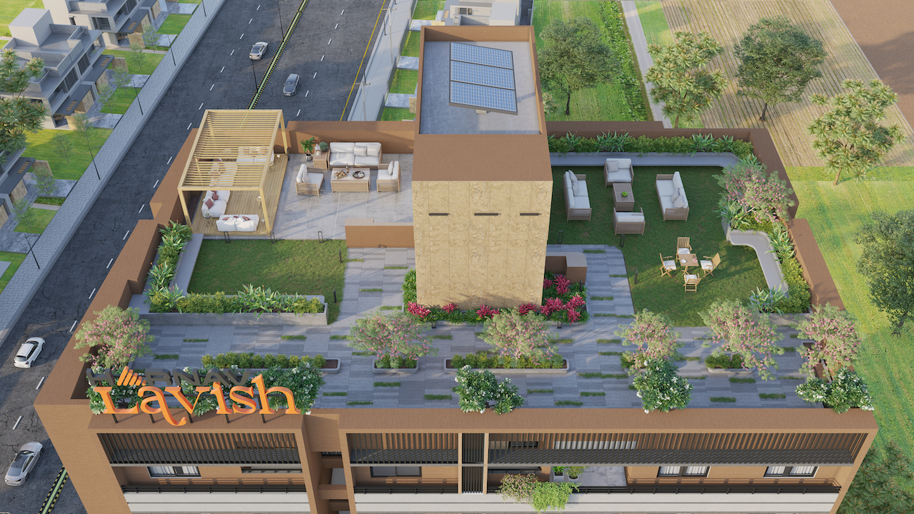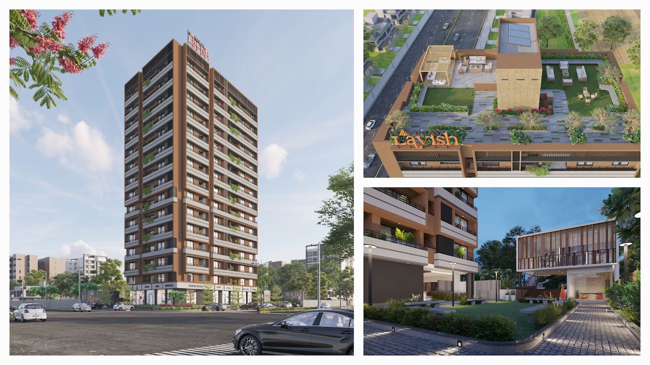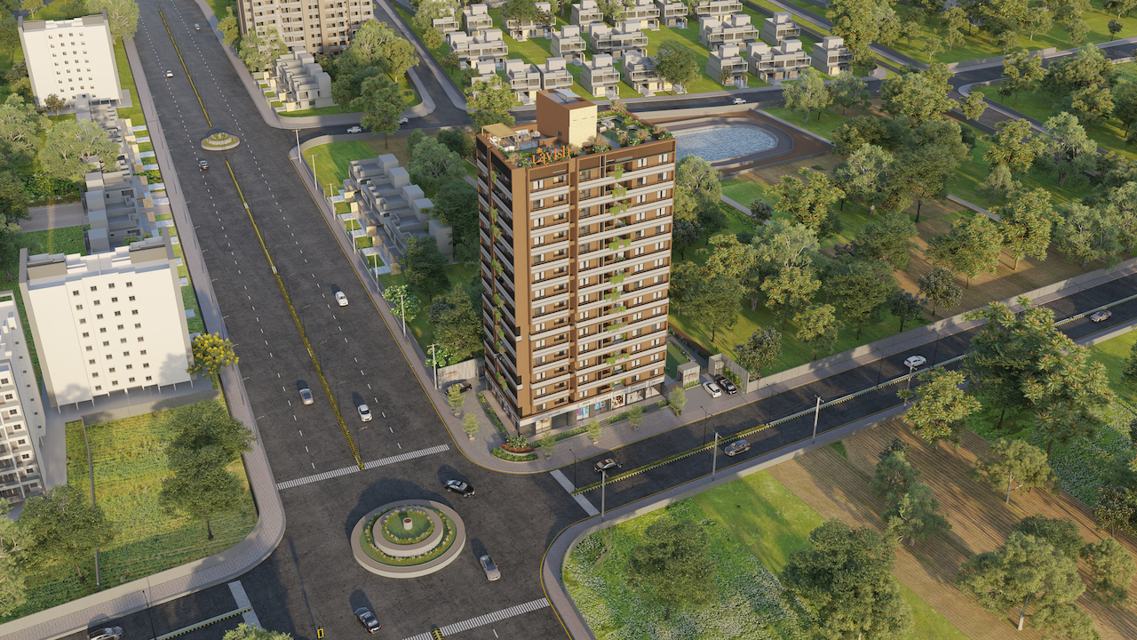 is an affordable apartment scheme located in the Zundal area of Ahmedabad, offering a total of 70 thoughtfully planned residential units, each ranging from 700 to 800 sq ft. The ground floor hosts commercial shops for everyday convenience, with well-ventilated residential units positioned above.