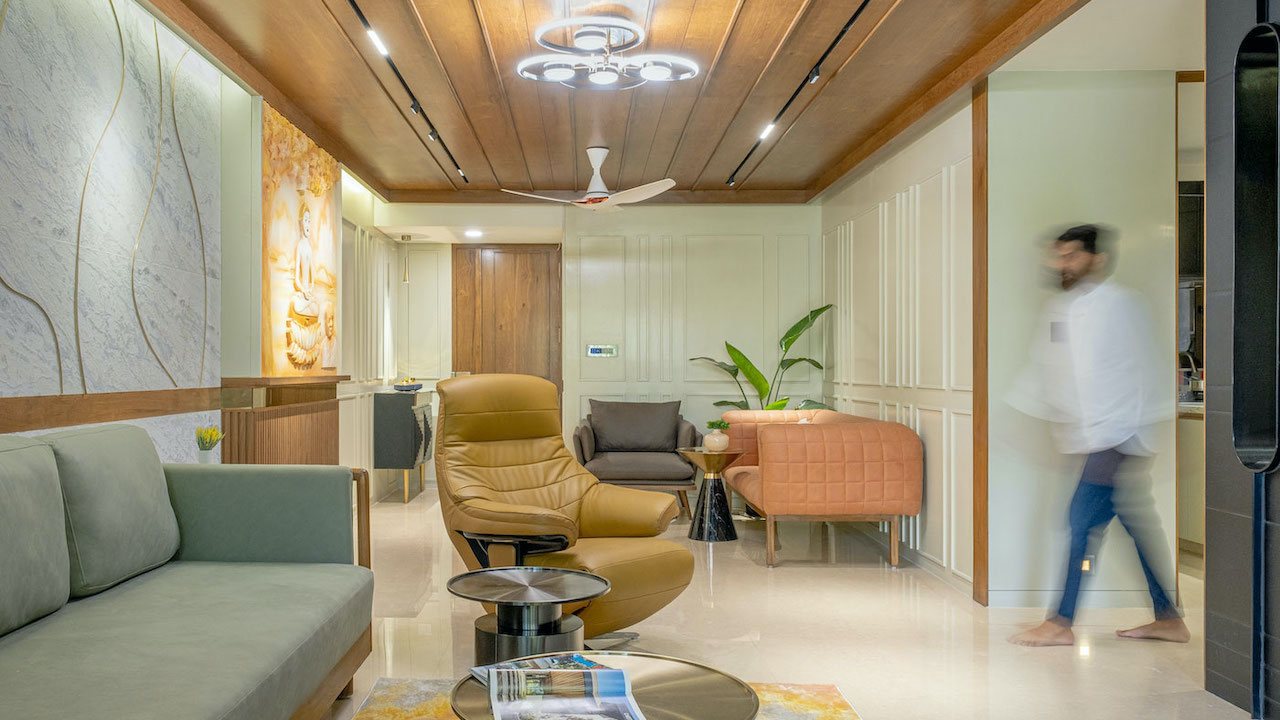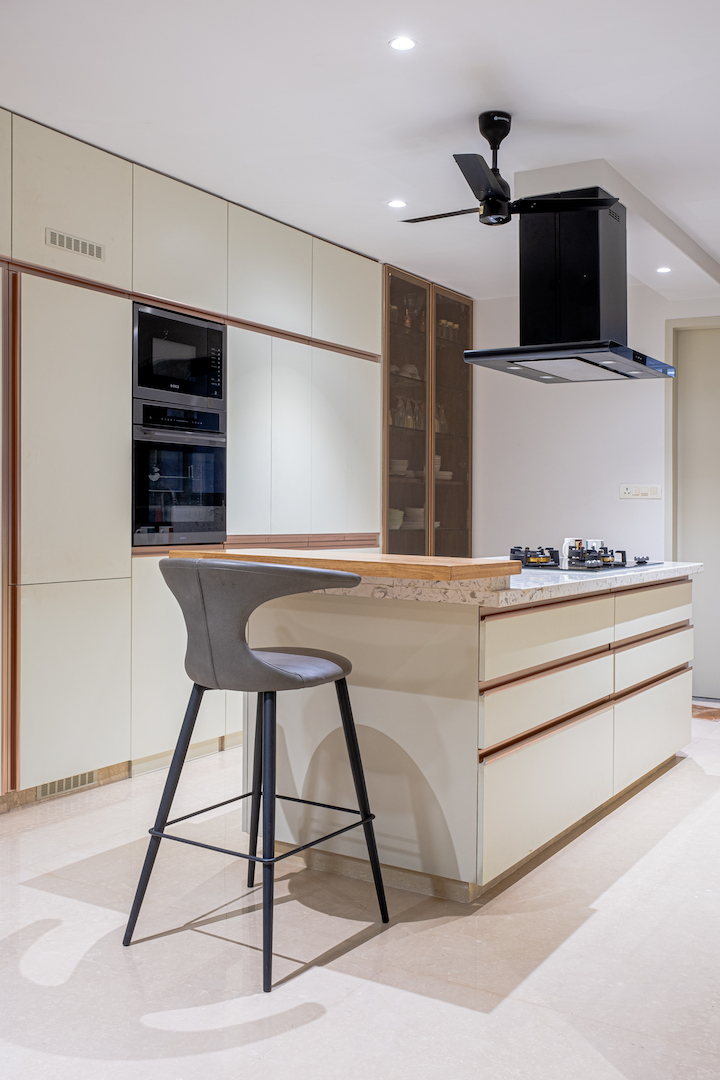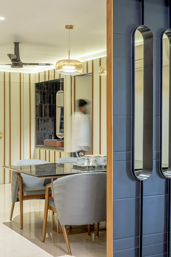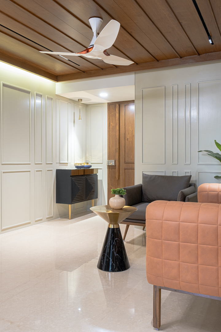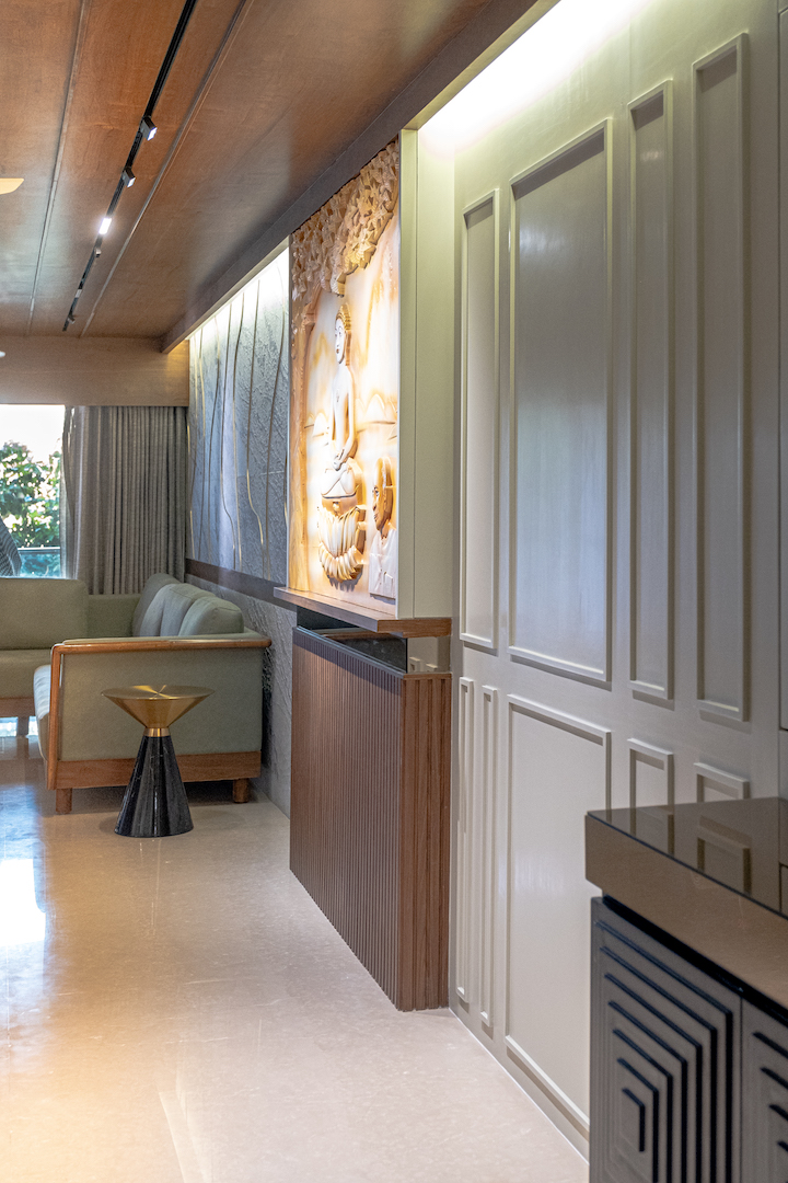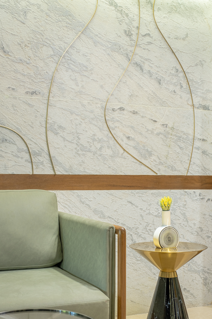 Moving into the drawing room, we opted for a minimal approach with a simple wooden door with carving, rust orange accent chairs, and patti detailing on the walls. The living space features a striking TV unit with cut-out details on black matt glass and an Italian textured stone cladding sofa with brass inlay, creating a stunning feature wall. The wooden ceiling with linear lighting and modern chandelier perfectly complemented the overall aesthetic. A carved stone mural on a side wall became a focal point and defined the luxurious choice of interior design.