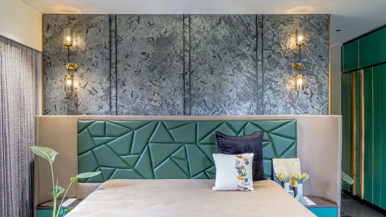 The client's master bedroom is unique and features a striking green color palette, with the entire wardrobe in a green PU finish with brass inlay, creating a luxurious look. The headboard is curved in a metal plate with leather cladding, creating a sophisticated look, and the green fabric pattern reflects the client's preference for color.