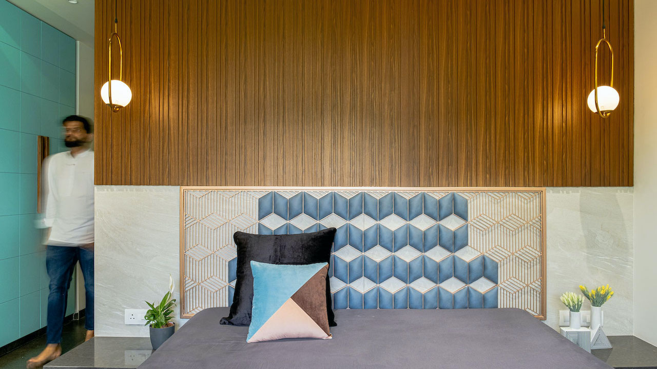 The daughter's room features a beautiful grey brick natural tile-cladded wall, with a deep red headboard with LED lights and a study table. The wardrobe shutter on the side wall has a fluted glass effect, adding some drama to the space. The son's room, on the other hand, features hexagon geometry headboards with linear wooden paneling and a wardrobe broken into three different materials, adding more surfaces to the room.