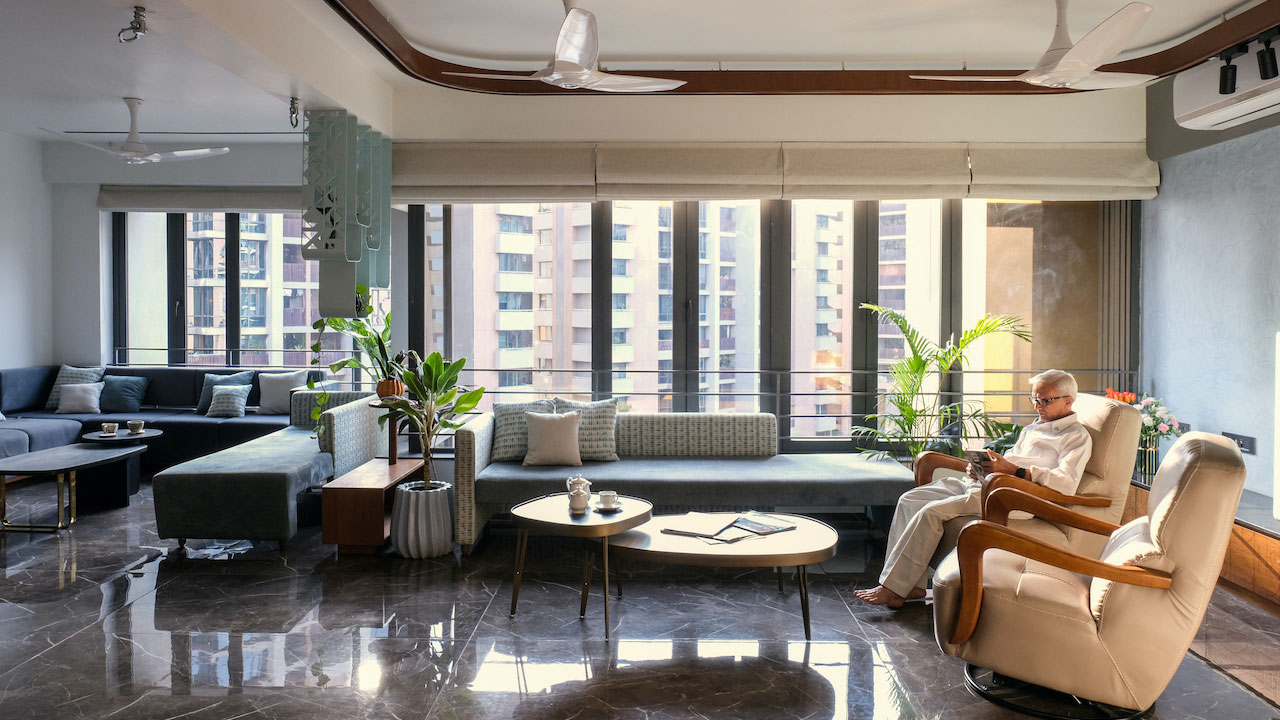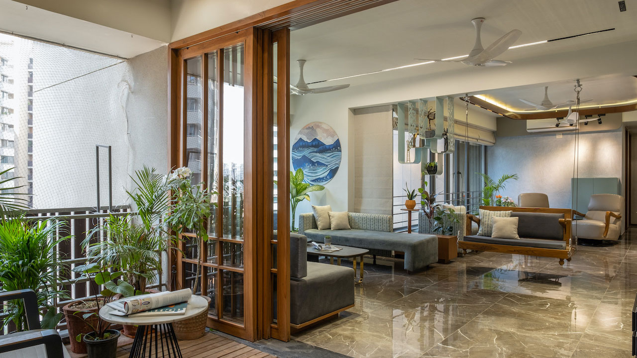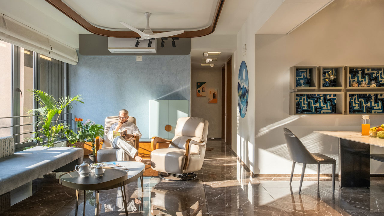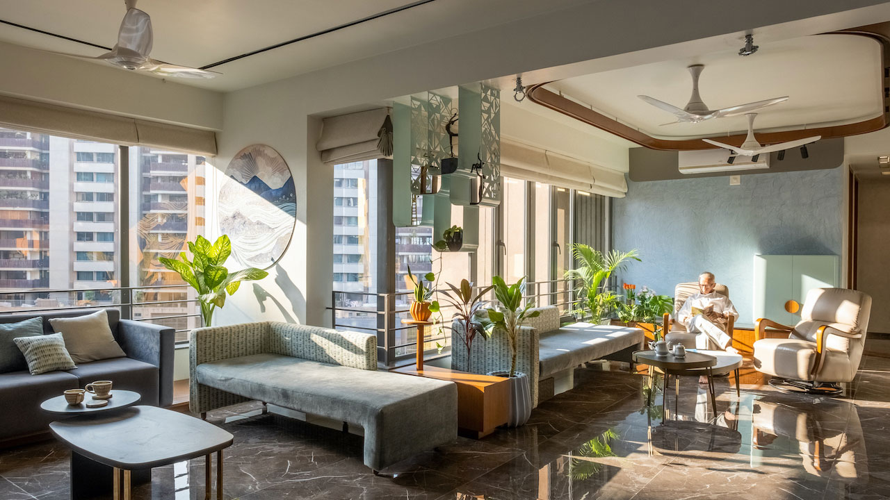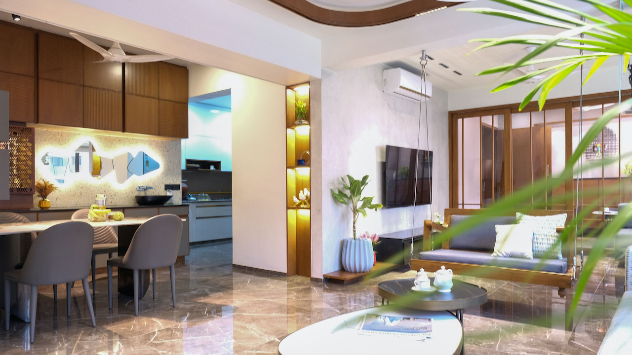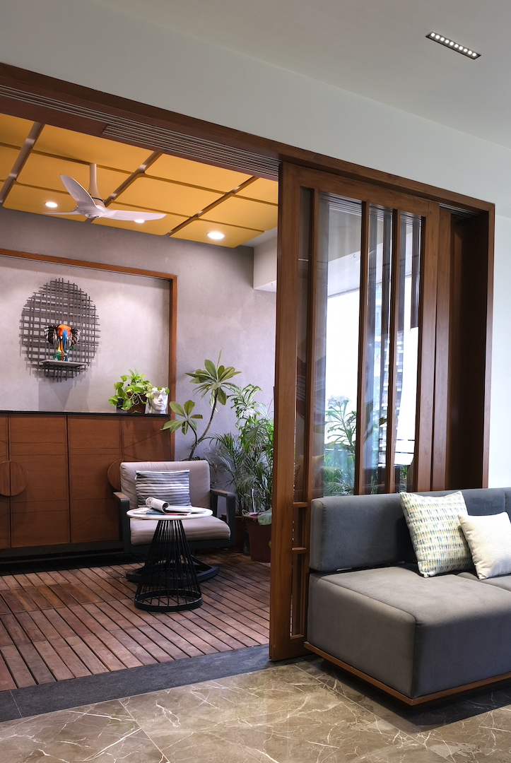 To demarcate the living and drawing areas while preserving a sense of connection, we introduced metal plate shelves with CNC detailing suspended from beam and a double side swing. These shelves and swing serve as both a physical divider and a metaphorical bridge, representing the interconnectedness of our personal and shared spaces.
