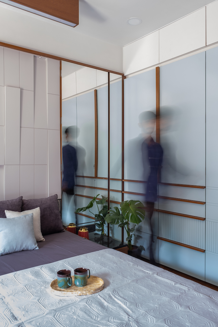 As one enters the master bedroom, a bronze mirror greets them, offering a moment of self-reflection. The simplicity of the bed backdrop in PU finish creates a serene atmosphere, allowing for undisturbed introspection. The wardrobes, designed with functionality in mind, feature drawers in their lower portions, emphasizing convenience and order, as even the smallest functional details can contribute to our overall well-being.