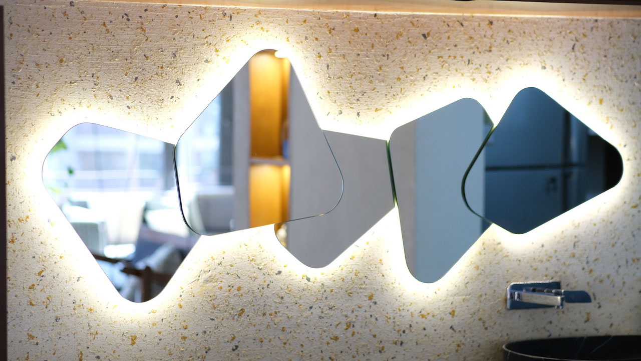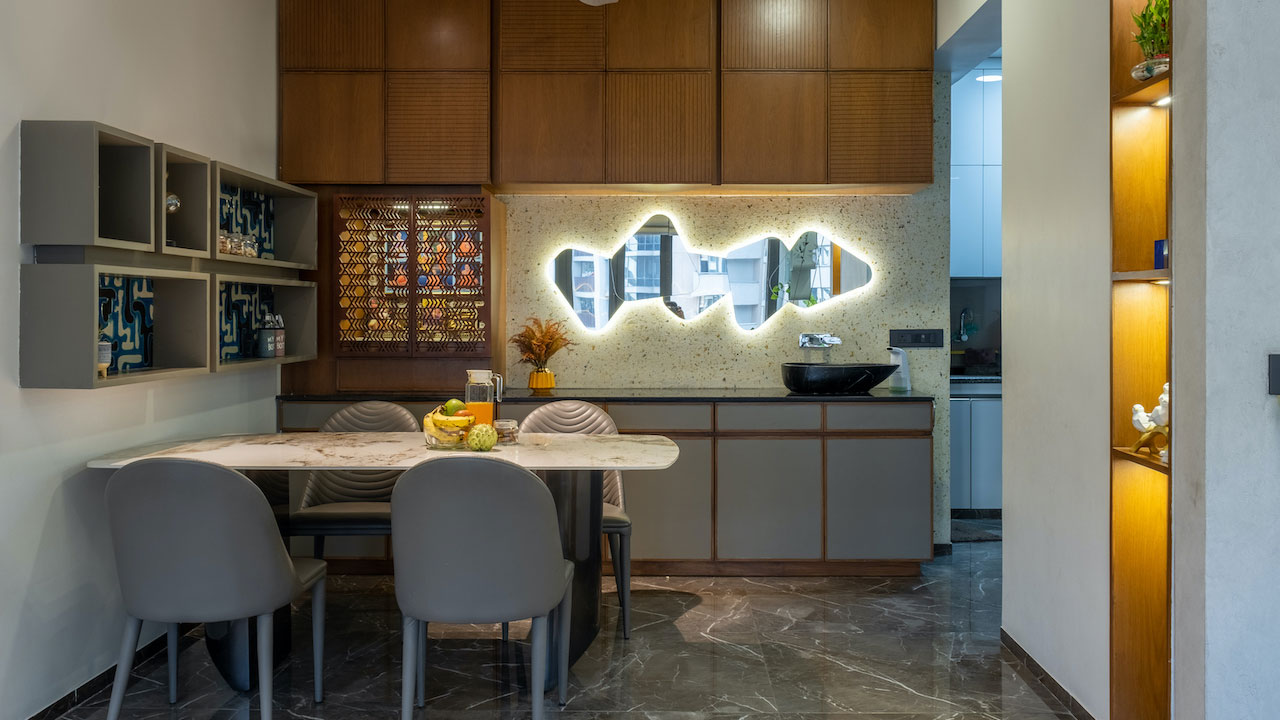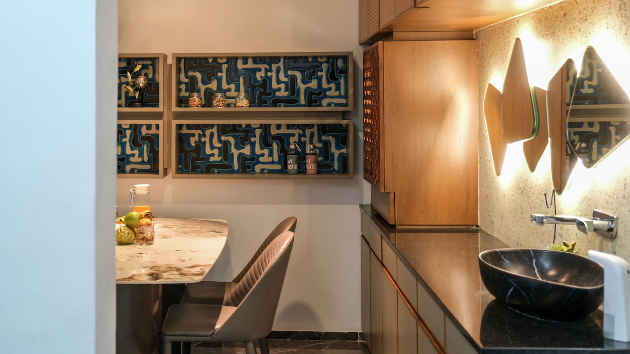 In the dining area, we created a wooden shelf adorned with enameled tiles to accentuate its significance. By incorporating modern mirrors, we aimed to enhance the spatial perception, creating a beautiful composition that reflects not only the physical surroundings but also the inner self. The mirrors symbolize the power of introspection and self-awareness, inviting occupants to contemplate their own reflections and fostering a sense of mindfulness.