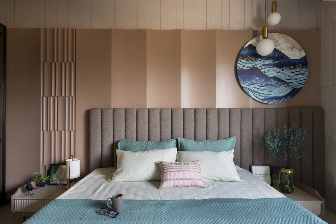 In contrast, the master bedroom exudes calm sophistication. Taupe and beige form the base of the palette, layered with geometric forms and softly illuminated surfaces. A grooved wall panel transitions into a mirrored surface, adding depth and light. The headboard, bench, and full-height fluted wardrobe in smoked glass are elegantly balanced by a suspended sea green metal shelf and a U-shaped mirror. The sea green TV unit subtly references the palette from the drawing room, reinforcing continuity.