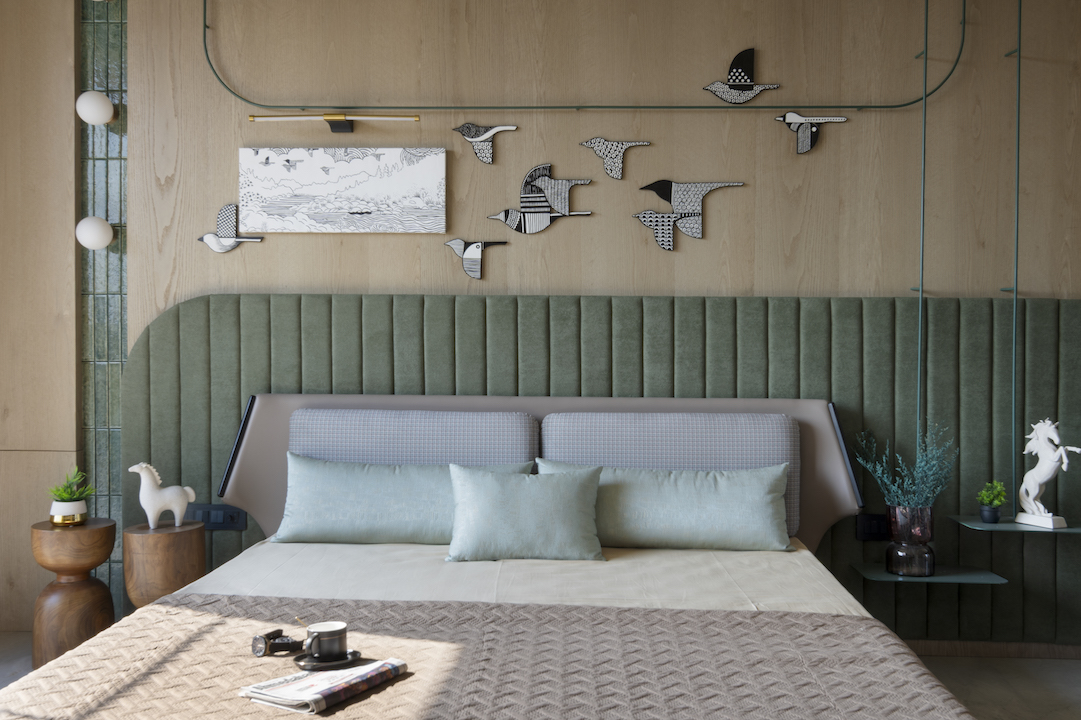 Finally, the second-floor master suite presents a luxurious retreat, offering both a sitting and resting area with an attached bath. A sculpted wooden panel curves behind the bed, broken beautifully by slits of green tiles and vertical rods with artwork. A green, curved wooden board continues the visual rhythm across the backdrop. The two functional zones are separated by a uniquely designed shelf, while the lounge beneath a coved POP ceiling features soft-toned furniture in beige and green. Camouflaged wardrobes blend into the paneling, and a long mirror wall with green shelving completes the visual narrative with finesse.