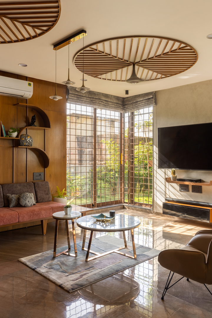 The kitchen was positioned near the entrance to allow glimpses of who's entering the vestibule through small openings that merge with the triangular pattern. The dining area has a huge window opening that overlooks the garden, and a double-height slab that's further enhanced with a bridge connecting to a bedroom. The living room is connected to the dining area with a cornered window glass, creating a feeling of being outdoors while still inside.